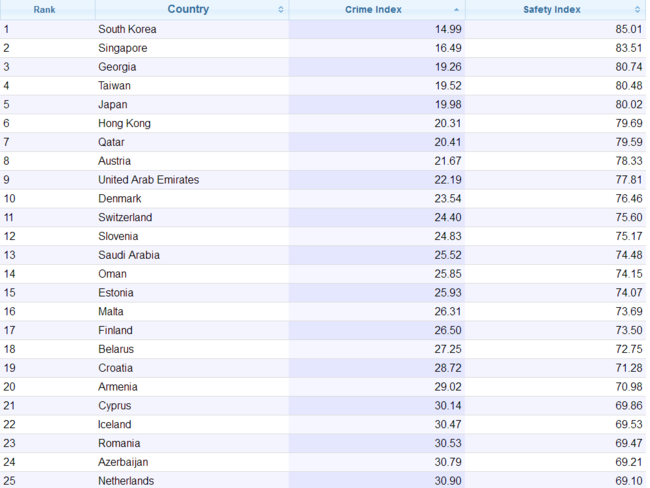 °¢Á¾ Åë°èÀÚ·á·Î ¼øÀ§¸¦ Á¤Çؼ º¸¿©ÁÖ´Â »çÀÌÆ®ÀÎ Numbeo°¡ ¹ßÇ¥ÇÑ ÀÚ·á¿¡ µû¸£¸é ¼¼°è Ä¡¾È ¼øÀ§ ±¹°¡ Áß 1À§¿¡ ·©Å©µÈ ³ª¶ó°¡ ¹Ù·Î ¿ì¸®³ª¶ó´Ù. Áï °¡Àå ¾ÈÀüÇÑ ³ª¶ó¶ó´Â Àǹ̴Ù. ÀÌ ¼øÀ§´Â ¹üÁËÀ²°ú Ä¡¾È»óȲ¿¡ ÇÊ¿äÇÑ °¢Á¾ ±â¹Ý½Ã¼³, °ø¹«¿øµéÀÇ È°µ¿ µîÀ» ±âÁØÀ¸·Î Æò°¡µÇ´Âµ¥ ¿ì¸®³ª¶ó´Â ¹üÁËÀ² ÀÚü°¡ Ÿ ±¹°¡µé¿¡ ºñÇØ ±²ÀåÈ÷ ³·°í °Ë°Å À² ¶ÇÇÑ °¡Àå ³ô´Ù°í Æò°¡ Çß´Ù. (»çÁø Âü°í)